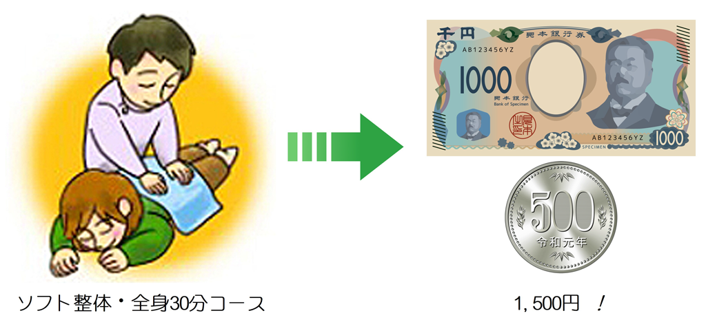 ご希望により、ソフト整体・全身30分コース[2,805円]を1,500円にてご利用いただけます(有効期間内/クーポン回数分)